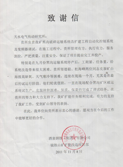 11月8日,酒泉鋼鐵(集團)鏡鐵山項目部發(fā)來《感謝信》向長城電工天水電氣傳動研究所有限責任公司表達謝意,對天傳所公司的精誠合作和公司員工的辛勤付出表示由衷地感謝。