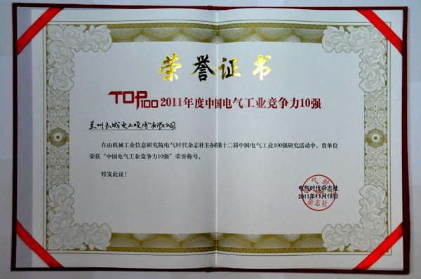 11月18日,在由機械工業(yè)信息研究院電氣時代雜志社主辦的“第八屆中國電氣工業(yè)發(fā)展高峰論壇暨第12屆中國電氣工業(yè)100強研究發(fā)布”會上,蘭州長城電工股份有限公司榮獲“第十二屆中國電氣工業(yè)100強”和“中國電氣工業(yè)競爭力10強”榮譽稱號。