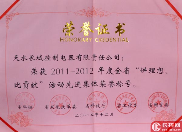 11月23日,長(zhǎng)城電工天水長(zhǎng)城控制電器有限責(zé)任公司在2011-2012年度全國(guó)“講理想、比貢獻(xiàn)”活動(dòng)中獲先進(jìn)集體榮譽(yù)稱號(hào),受到中國(guó)科協(xié)、國(guó)家發(fā)展改革委、科技部、國(guó)務(wù)院國(guó)資委聯(lián)合表彰。
