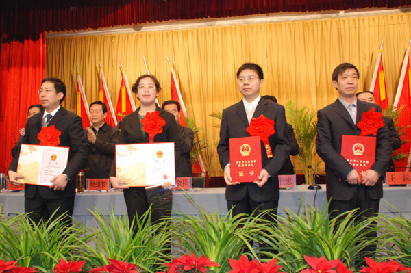 長(zhǎng)開(kāi)廠(chǎng)公司技術(shù)中心有關(guān)負(fù)責(zé)人和獲獎(jiǎng)成果研發(fā)人員(左一)代表參加表彰大會(huì)并上臺(tái)領(lǐng)獎(jiǎng)。 |