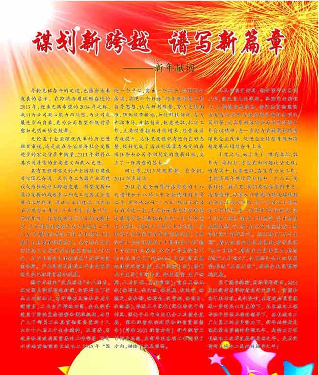年輪見證奮斗的足跡,也蘊(yùn)含未來(lái)發(fā)展的啟示。在即將告別砥礪奮進(jìn)的2013年,迎來(lái)充滿希望的2014年之際,我們?yōu)楣灸木哿Χ牢,為公司發(fā)展進(jìn)步而自豪,更為公司轉(zhuǎn)型升級(jí)前景愈加光明而倍受鼓舞。