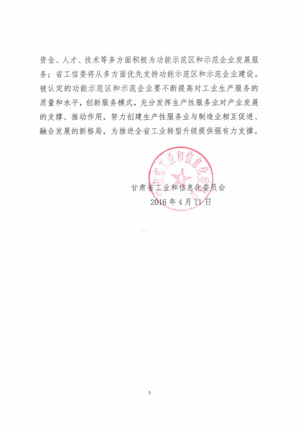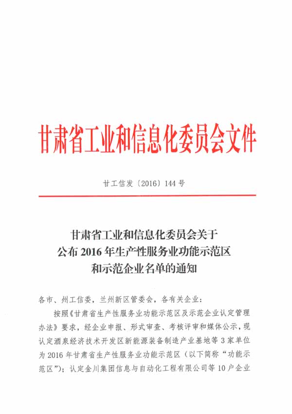 經(jīng)過企業(yè)主觀材料申報,甘肅省工業(yè)和信息化委員會形式審查、考核評審和媒體公示,公司被甘肅省工業(yè)和信息化委員會認(rèn)定為2016年甘肅省生產(chǎn)性服務(wù)業(yè)示范企業(yè)。